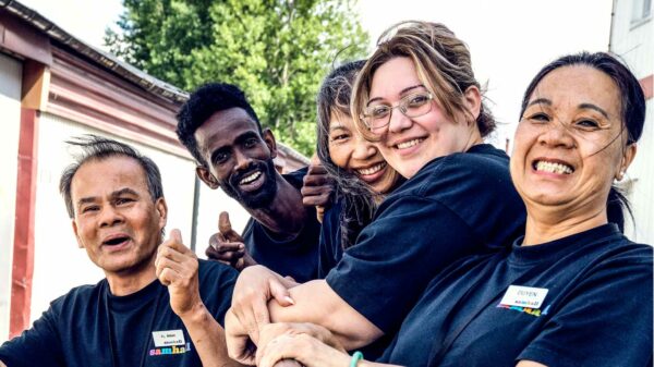 Samhallarbetare sitter i grupprum. Två av dem ger high five till varandra